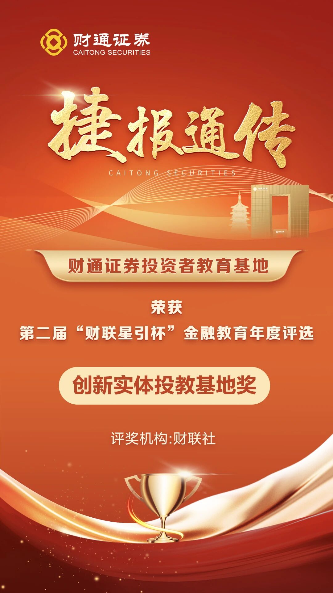 捷报通传丨财通证券投教基地荣获“财联星引杯”创新实体投教基地奖