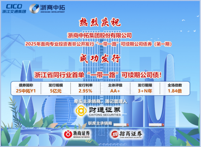 【以客户为中心 | 财通证券服务国家重大战略,助力浙商中拓成功发行“一带一路”可续期公司债】:您是否在找【财通成长优选混合型证券投资基金】、【财通证券同花顺交易软件】、【同花顺财通证券手机版】、【同花顺财通证券期权版】、【同花顺财通证券经典版】、【财通基金定增研究中心】、【财通成长优选混合基金】、【财通证券同花顺手机版】、【财通证券大智慧专业版】、【财通证券手机交易软件】,【以客户为中心 | 财通证券服务国家重大战略,助力浙商中拓成功发行“一带一路”可续期公司债】【近日,由财通证券牵头主承销的浙商中拓集团股份有限公司2025年面向专业投资者非公开发行“一带一路”可续期公司债券(第一期)成功簿记发行。本期债券发行规模5亿元,期限为3+N年,全场认购倍数高达1.84】