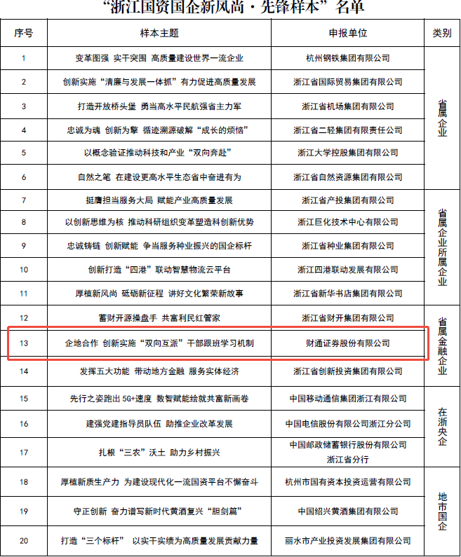 近日,浙江省国资协会公布了20个入选“浙江国资国企新风尚·先锋样本”的名单,经过集中展播、专家评析、组织评定,财通证券报送的“企地合作 创新实施‘双向互派’干部跟班学习机制”案例,从近50份报送案例中脱颖而出,成功入选“浙江国资国企新风尚·先锋样本”。