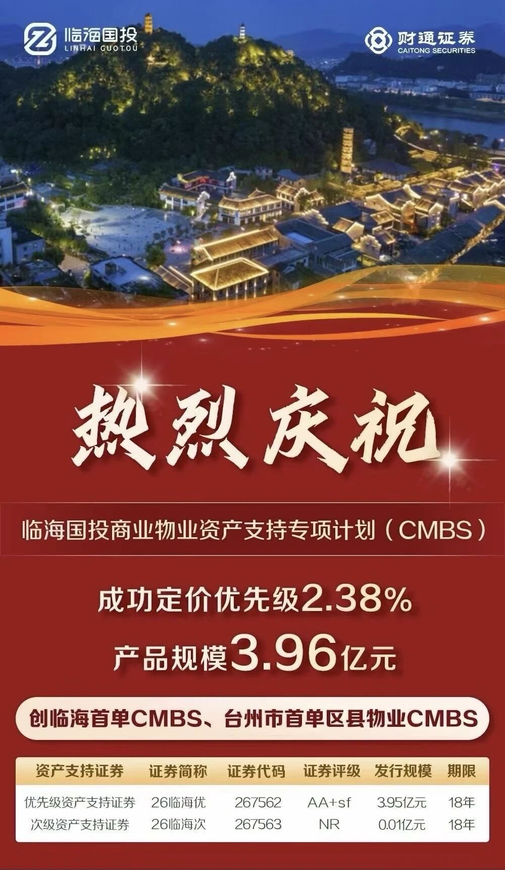近日,由财通证券担任牵头销售机构的 “临海国投商业物业资产支持专项计划”于上海证券交易所发行成立。作为台州区县首单CMBS产品,该项目的成功发行标志着临海市国有资产投资控股集团有限公司(以下简称“临海国投”)实现资本市场创新融资领域新的突破,也是财通证券秉持“以客户为中心”理念,践行“资本市场服务实体经济”又一典型案例。
