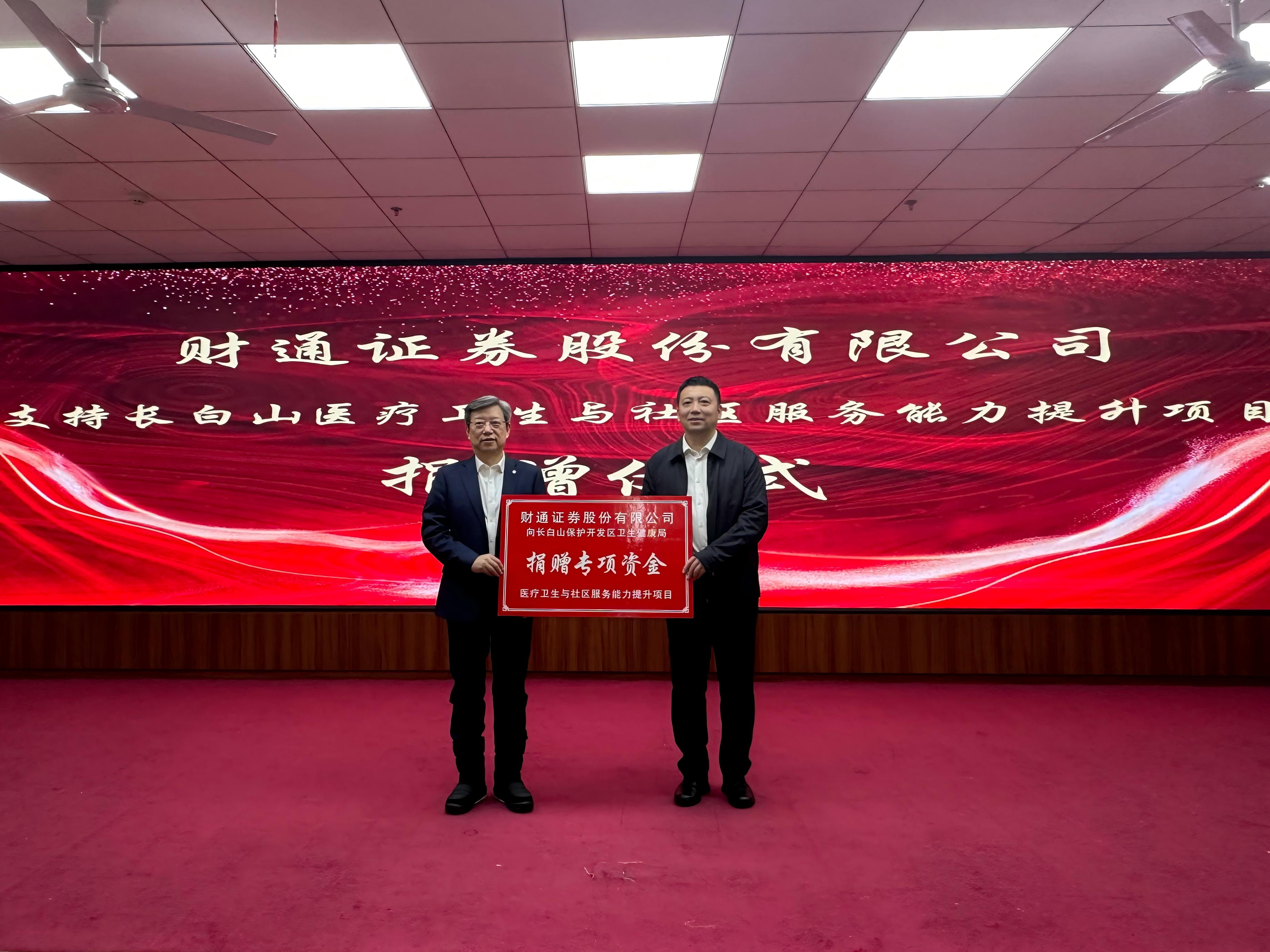 在详细了解了当地医疗卫生与社区服务的现状和需求后,章启诚代表财通证券向长白山保护开发区卫生健康局捐赠专项资金,定向用于医疗服务相关设备采购及建设。章启诚表示,希望以绵薄之力搭建一座爱心之桥,助力改善当地卫生服务的硬件条件,完善偏远地区群众就医服务体系。同时,财通证券也会继续关注当地的民生需求,通过精准帮扶,书写浙吉对口合作的金融赋能好故事,为加快建设健康中国作出积极贡献。