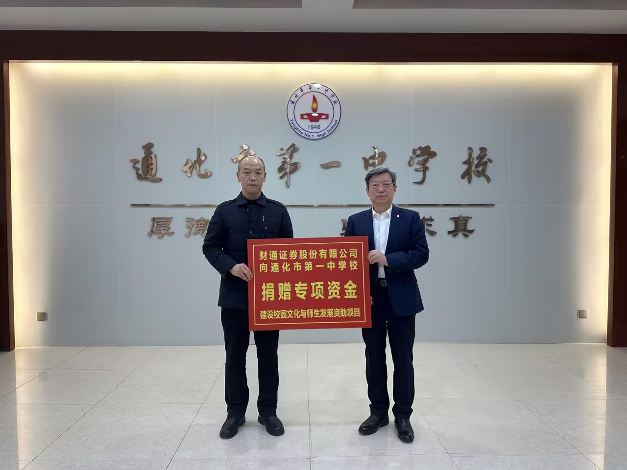 捐资仪式上,章启诚代表财通证券向通化一中捐资,旨在助力该校改善基础办学条件,更好滋养人才成长土壤。他表示,此次捐资交流是“感恩有缘、感动一中、感望未来”。浙吉对口合作辛勤耕耘,两地已拥有跨越山海、携手同行的深厚情谊。财通证券作为浙江省属金融国企,始终将服务国家战略、践行社会责任视为立企之本,也在持续关注和支持教育事业发展。希望通化一中的学子能在“第二课堂”中体验金融教育、锻炼金融思维,未来积极投身浙吉两省的产业合作、创新联动,让青春之花绽放在祖国最需要的地方。
