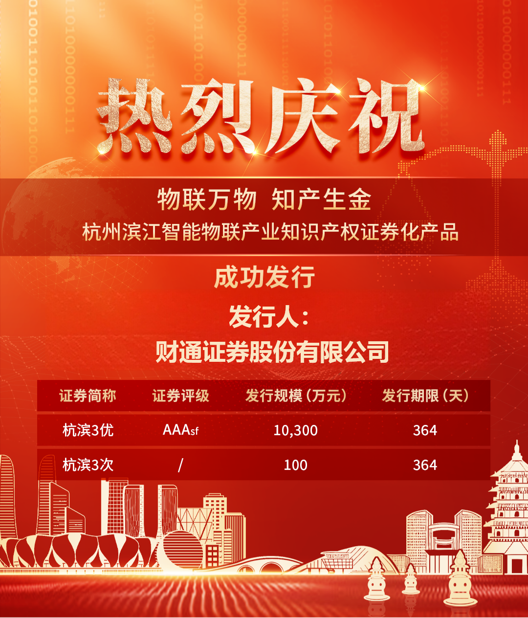3月17日,财通证券主导发行的“财通-杭州滨江知识产权第3期资产支持专项计划(科技创新)”在深交所挂牌发行,发行规模1.03亿元,是首个以智能物联产业为主题的知识产权证券化产品。