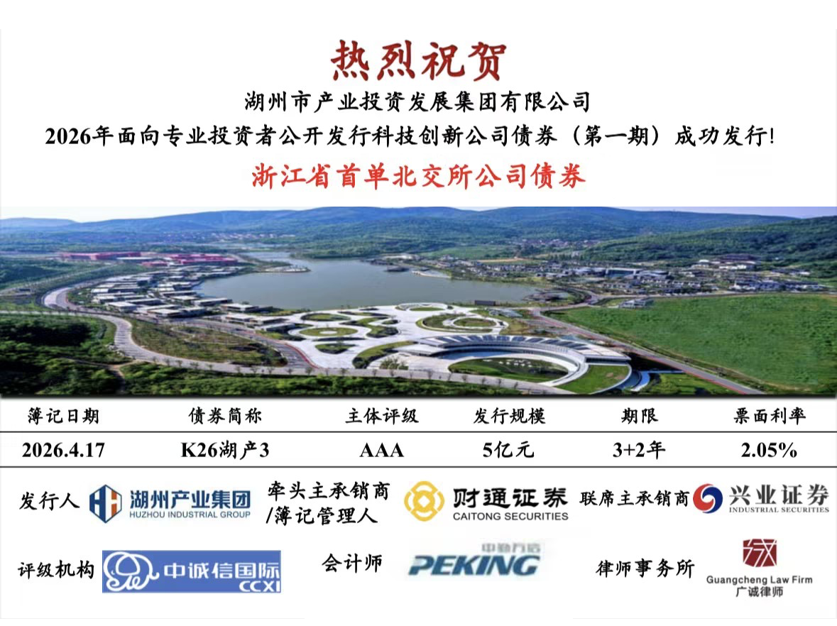 近日,由财通证券牵头主承销的湖州市产业投资发展集团有限公司2026年面向专业投资者公开发行科技创新公司债券(第一期)成功簿记发行。本次发行规模5亿元,期限3+2年,票面利率2.05%,成为浙江省首单北交所公司债券,为浙江省国资国企开辟全新融资路径、打造创新融资样板树立了典范。