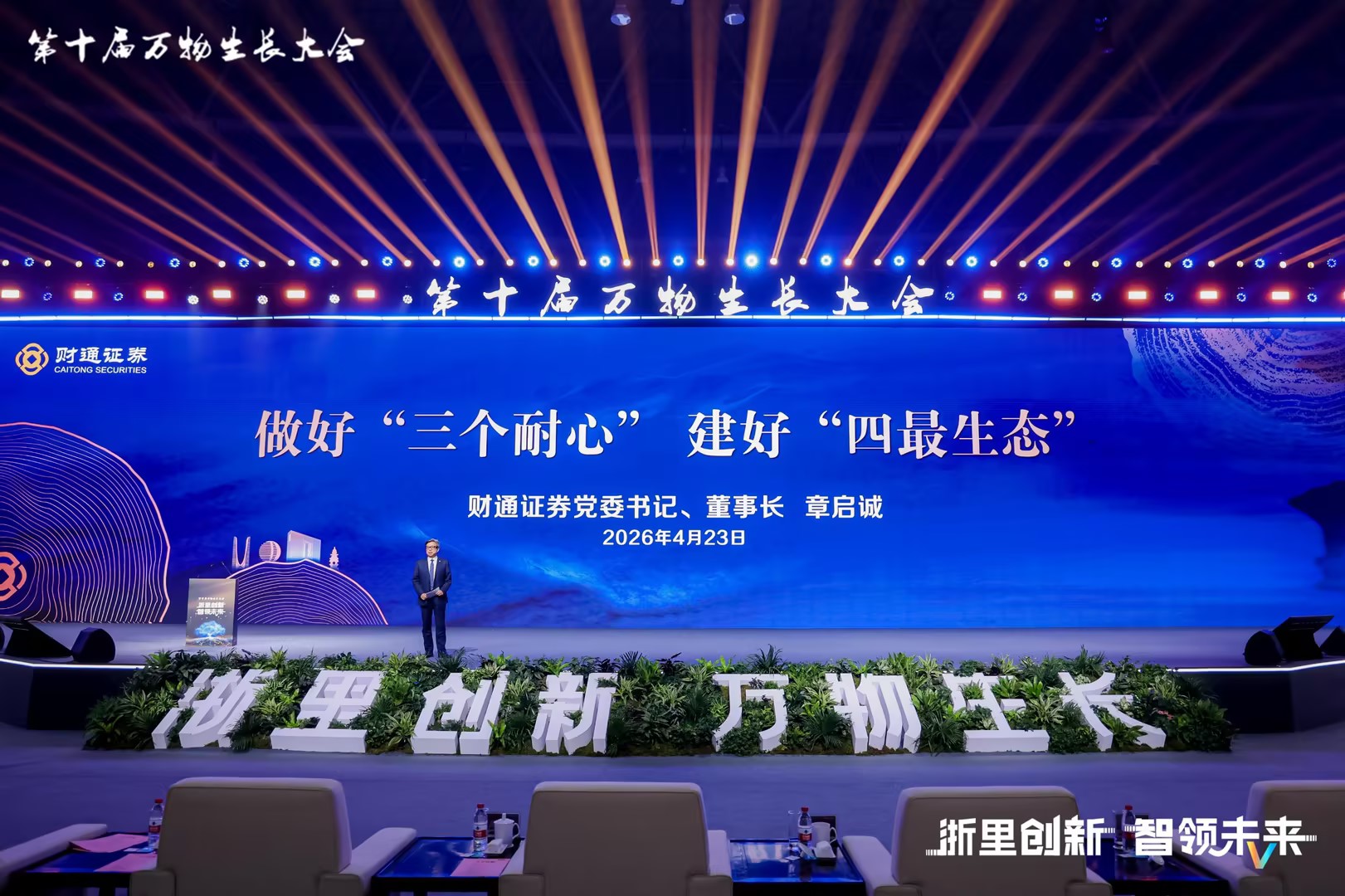 2026年4月22-24日,以“浙里创新、智领未来”为主题的第十届万物生长大会在杭州市国际博览中心举行。全国政协副主席、全国工商联主席高云龙,全国政协常委、民建中央副主席、上海市副市长解冬,浙江省委常委、统战部部长冯怡,全国政协常委、浙江省政协副主席、民建省委会主委陈小平,杭州市政协党组书记、主席王文序,财通证券党委书记、董事长章启诚,党委委员、副总经理夏理芬,副总经理吴佳伟等出席活动。作为大会唯一战略合作券商,财通证券深度参与大会主论坛,并承办2026长期资本大会,协办专精特新分论坛、独角兽海外上市对接会等多个分论坛,全力支持万物生长大会系列活动。